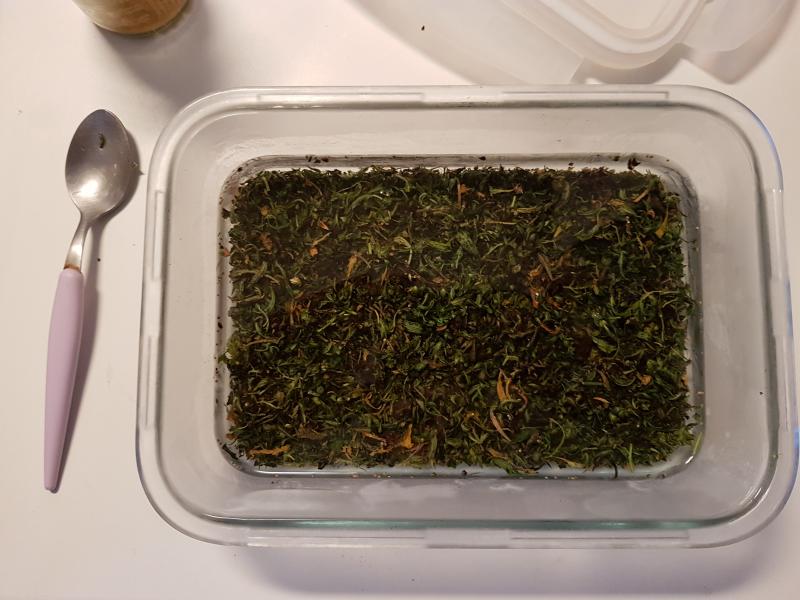 Du coup, il est bon de rappeler que d'extraire dans de l'alcool ça n'en fait pas une teinture mère efficace si la weed n'a pas été décarboxylée avant, même si il est permis de penser que les cannabinoides non décarbo peuvent aussi avoir une utilité médicale... mais pas pour planer malheureusement, ce qui oblige à perdre partiellement les "aromatiques".